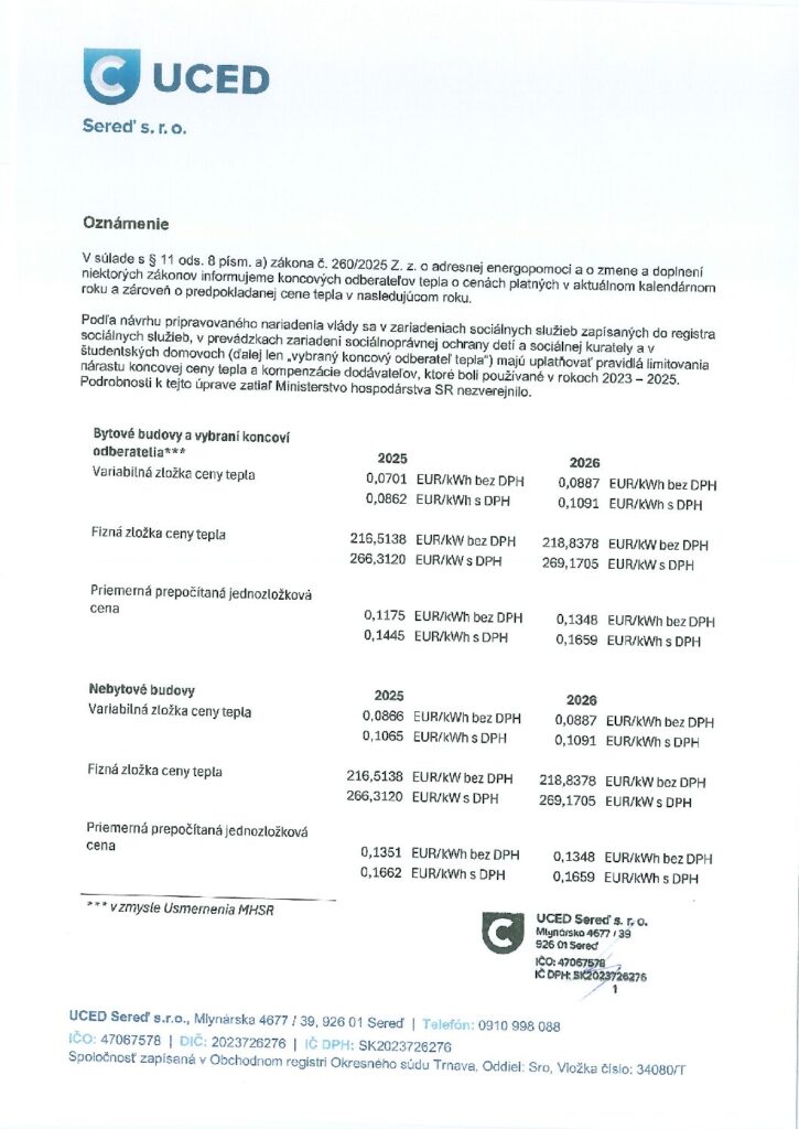 týmto Vám oznamujeme, že s platnosťou od 1.januára 2026 dodávateľ tepla spoločnosť UCED Sereď s r.o už nebude poberať dotácie od štátu na vykrytie nákladov spojených s výrobou a dodávkou tepla. Z uvedeného dôvodu pri fakturáciách za dodávok tepla na kúrenie a tepla na ohrev vody bude od 1.1.2026 uplatnená plná (nedotovaná) cena tepla. Vyššiu fakturovanú cenu za teplo štát bude kompenzovať adresnou energopomocou v zmysle zákona č.260/20025 Z.z. Vlastníci bytov budú dostávať priamo od Ministerstva hospodárstva SR tzv. „energošeky“ na čiastkovú úhradu nákladov. Presnú výšku a podmienky poskytnutia tejto pomoci upresní vyhláška.